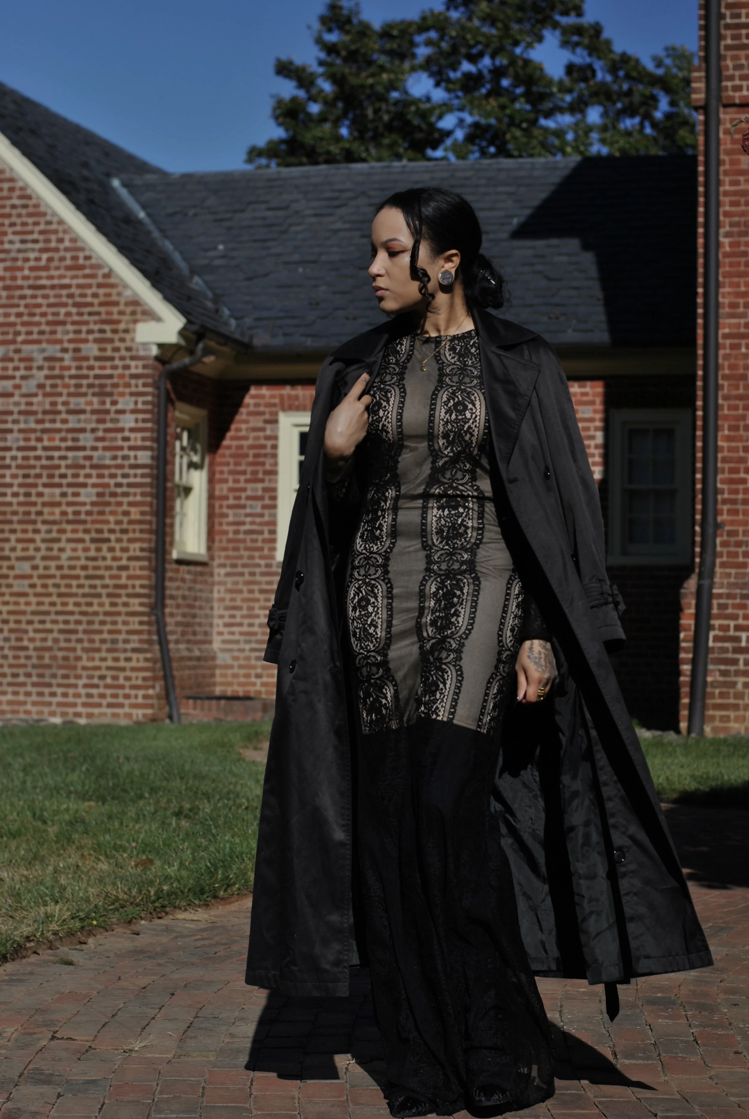 I’m always thankful to happen upon a really dramatic, “right place, right time” kind of piece. This look combines two of my favorite thrift store finds for the colder months: a gorgeous, black satin-esque trench that looks like it came from the set of The Matrix, and this stunning, floor-length maxi dress that features a nude mid-length dress draped in black lace.